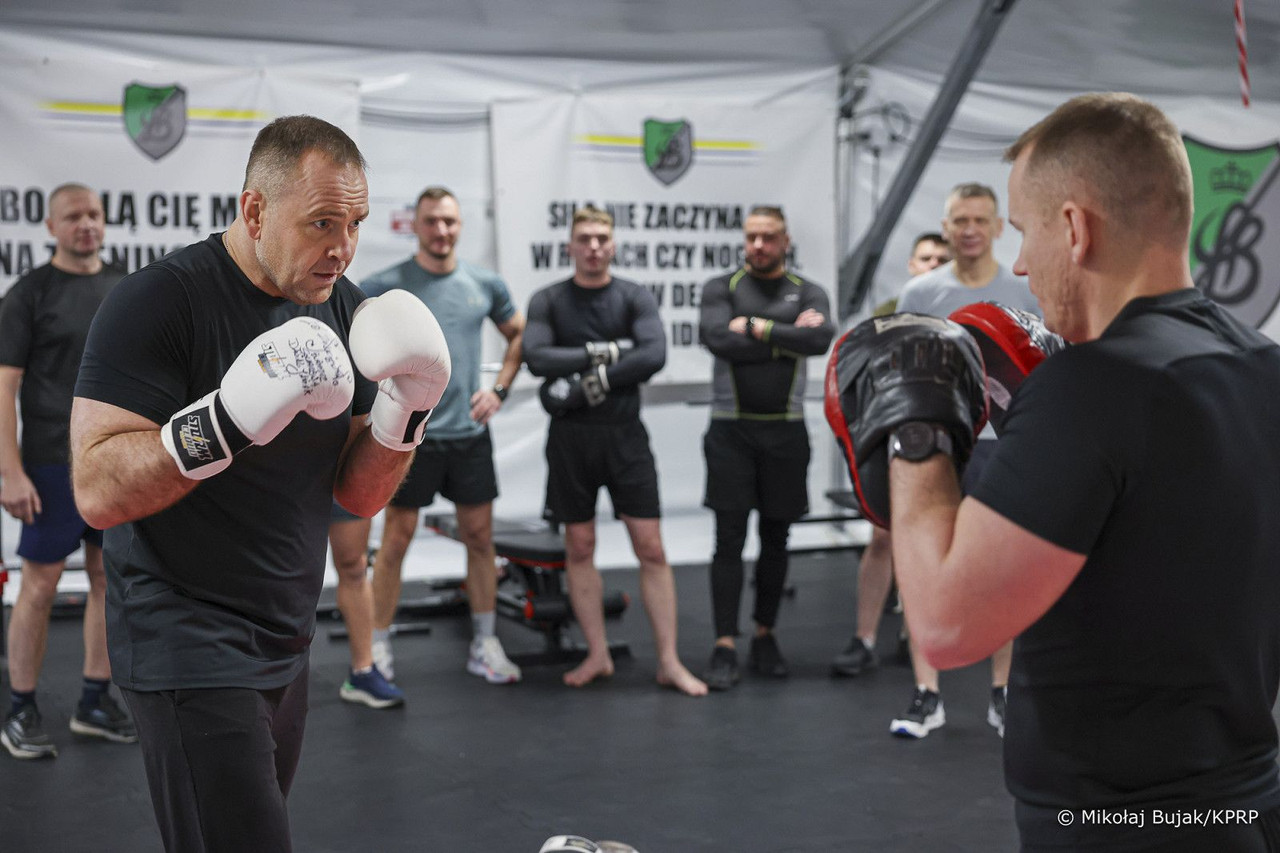 Sparing bokserski Karol Nawrocki z polskimi żołnierzami podczas wizyty na polsko-białoruskiej granicy w Wigilię Świąt Bożego Narodzenia 2025 roku.