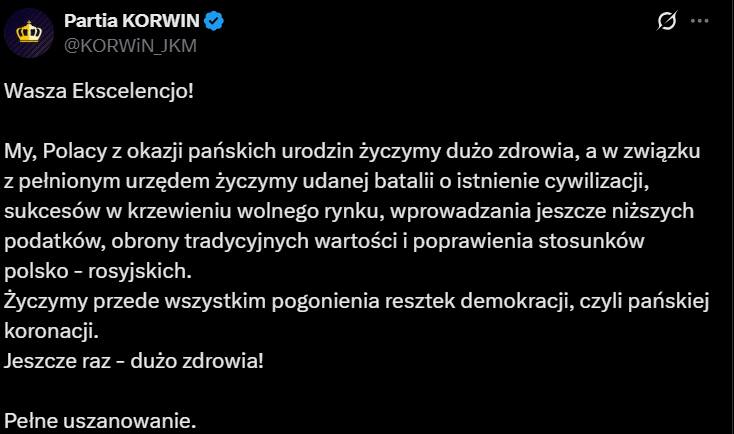 • Prezydentem może nie, ale na pewno niewiarygodnie ważny. Trochę jak Hołownia. Sodóweczka uderzyła do głowy. Jakby był mądrzejszy to by się z PiSem dogadał. A tu Korwin reaktywował Konfederacje II. Gdyby teraz się Bosak odwrócił to przyjmując naiwnie, że oboje zostają z jakimś 6 % poparciem, wredy Korwin podbierając od Mentzena ma szanse go zatopić.
