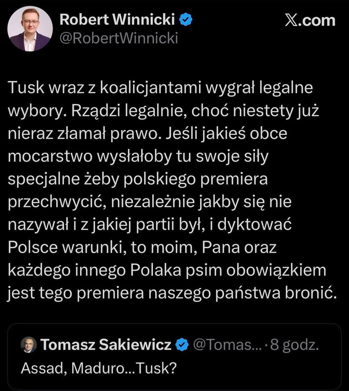 Winnicki to nawet przy okazji oddał hołd Tuskowi przyznając, że wygrał zupełnie legalnie wybory. Tak że tak to, zmieniać władzy przy wykorzystaniu Delta Force nie można, to brzydko, ale zmieniać przy pomocy USAID i/lub niemieckich fundacji - to jest po republikańsku.