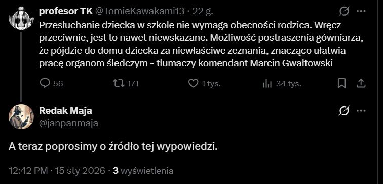 Policja de facto tłumaczy się że przesłuchiwała na zlecenie prokuratora. Mec Kwaśniewski wspomina o naruszeniach. Rodzice nie zostali powiadomieni o podjęciu czynności z należytym wyprzedzeniem.. być może sami policjanci byli zaskoczeni.