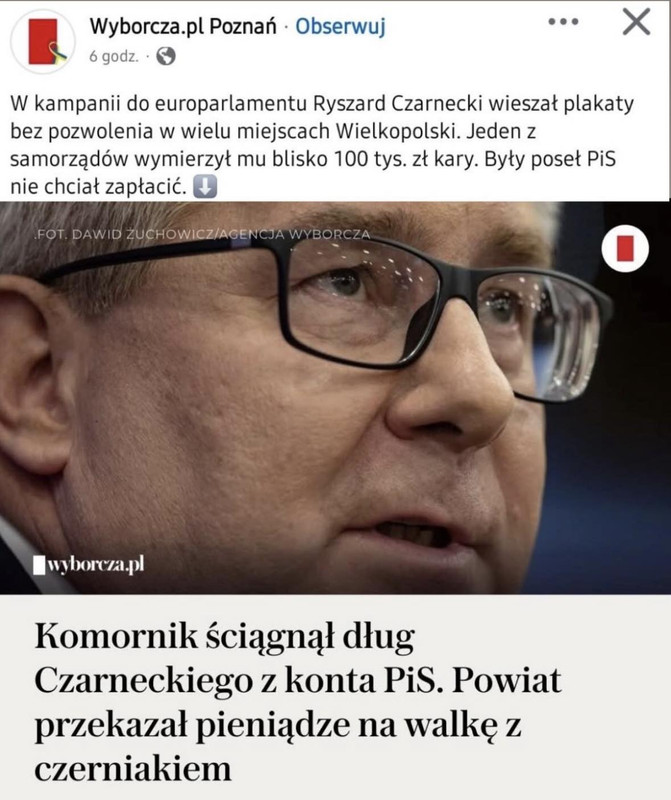 "Podczas kampanii do Parlamentu Europejskiego w 2024 roku Czarnecki walczył o piątą kadencję europosła. Zarzucił Wielkopolskę swoimi materiałami wyborczymi. Wieszał plakaty i banery bez pytania o zgodę - na płotach prywatnych posesji, instytucji samorządowych, obiektach kościelnych, a nawet na znakach drogowych."