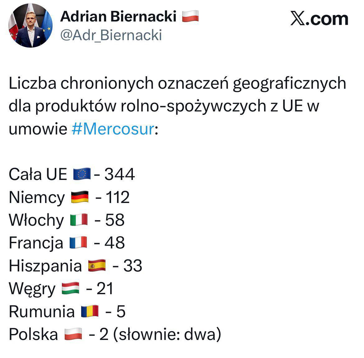 Natomiast w umowie z Mercosur chronione są tylko dwa polskie oznaczenia geograficzne - "polska wódka" i "żubrówka"