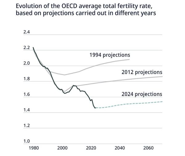 Prognozy demograficzne sporządzone w 1994 roku zakładały, że wskaźnik dzietności w krajach wysoko rozwiniętych (OECD) osiągnie w 2040 roku poziom około 2,1.