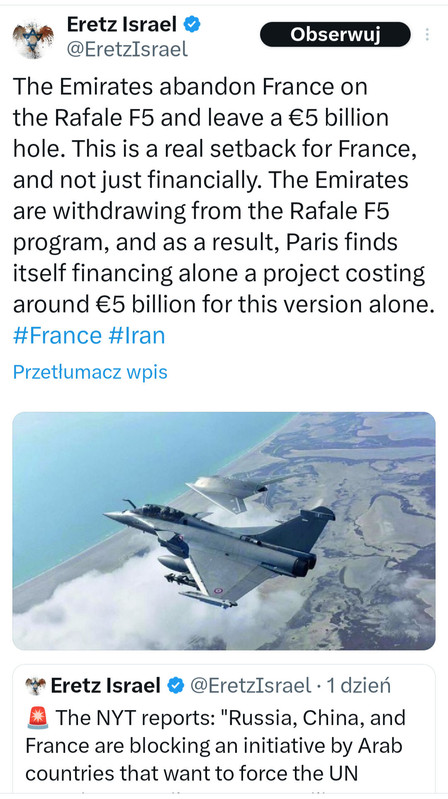• "Zjednoczone Emiraty Arabskie zerwały warty 5 mld euro kontrakt zbrojeniowy z Francją na współpracę w rozwoju samolotów Rafale F5."